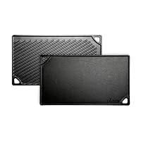 What could be better than a reversible griddle?The smooth side is great for making grilled cheese sandwiches as well as eggs, pancakes and french toast.The ribbed side is perfect for grilling foods such as steak, fish, chicken and hamburgers.The food sits above the grease making your cooking experience much healthier. Seasoned and ready to use. 16-3/16" x 9-7/16" x 1/2"