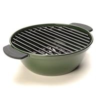 For those who don't enjoy grilling outside in the winter, this range-top grill brings the unique quality of outdoor grilling indoors--in any type of weather. The round-shaped unit offers an opening on the bottom that allows it sit over the burner of any standard, raised electric, gas, or propane stove. Enjoy open-flame cooking while keeping the mess of barbecuing contained within the grill. The indoor grilling tool features the same heavy-duty porcelain-coated grate design, enameled-steel firebox, and cover as the outdoor Minden Master Grill. Use it to barbecue anything from steaks and burgers to chicken or fish. The unit's heat shield helps ensure food cooks evenly, plus it deflects dripping fat and grease into a trough to prevent flair-ups. For added convenience, silicon handles offer safe portability, plus they can be removed for cleaning the grill in the dishwasher or self-cleaning oven. Be sure to use the grilling tool on a range with adequate ventilation since it performs similarly to a real barbecue range. The range-top grill measures approximately 17 by 15 by 8 inches and carries a one-year limited warranty.