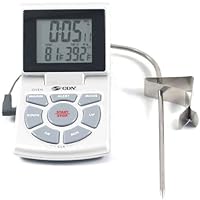 The CDN DTTC-W Combo Probe Thermometer, Timer and Clock is a precision, multi-purpose cooking thermometer that's also a 24-hour timer and oven tester. Stainless steel probe measures internal food temperature while roasting, with a 3 foot cable that reaches from the food to the thermometer unit on your stovetop or counter. There's also a special saucepan probe attachment for sauces and candy. Digital memory stores high and low temperature extremes for oven testing. Features an ABS plastic casing, large 3/4" display numerals that are easy to read, dual progress display, independent thermometer and timer alarms, last count recall, clock and temperature guide. Counts up and down. Counter top or magnetic surface mount. Battery (one 1.5V AAA IEC LR03 Alkaline) and instructions included. 5 year limited warranty.