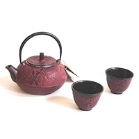 A lovely example of the traditional cast-iron teapots known in Japan as tetsubin, this pot with its delicate, hand-cast, raised design in highlighted in black is not only prized as a collectible, but also brews 20 ounces of tea perfectly. Its interior is glazed in enamel, so it won't rust or corrode; nor will its stainless-steel infuser. To make soothing, full-flavored tea, simply spoon loose tea leaves into the infuser, pour on simmering water, and allow to steep for three to five minutes. The heavy cast-iron construction retains heat so well, it ensures second cups will still be hot.A GREAT GIFT IDEA JAPANESE CAST IRON TEA POT SET. This Cast Iron tea pot set is in a dark red with elegant bamboo pattern. The set includes: 1 Red Tea Kettle (5.25" Dia. 3"H), 21oz 2 Matching Red Tea Cups (3"Dia. 2"H) 1 Removable Stainless Steel Infusing Basket "Tesubin" Teapot Cast Iron teapots were first created in ancient China. They were later adopted and refined by the Japanese into Tetsubin: Graceful, elegant vessels for brewing and serving tea. Made of specially purified cast iron, they are symbolic of strength and unity. A coating of black enamel is applied to the inner surfaces to help prevent the development of rust. A removable stainless steel infusing basket is supplied for ease of preparation,. As with all "tetsubin" (cast iron teapots) this will brew a marvelous pot of tea and keep it hot for quite some time.
